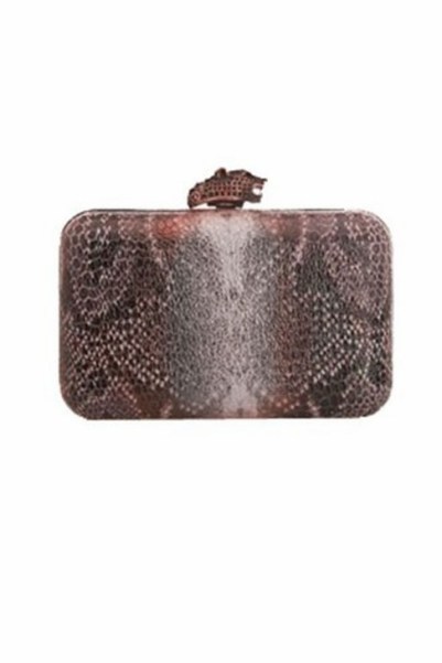 Her leather clutch features a black and brown snake print with a silver sheen and a black rhinestone encrusted jaguar clasp. A great piece to add to your collection if you’re looking for an exotic touch without breaking the bank.