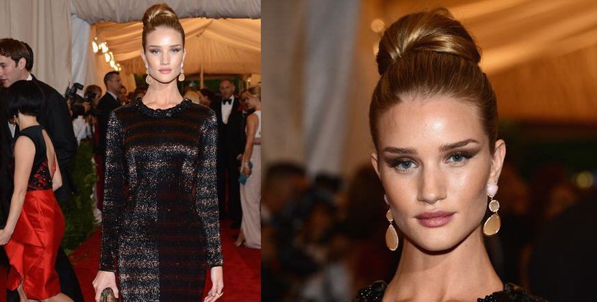 Rosie Huntington-Whiteley is one of the world’s most beautiful women and she looked the part at the 2012 Met Gala. She opted for a long-sleeve striped Burberry gown, equipped with a train and accessorized with beautiful statement earrings and a House of Harlow 1960 Marley Clutch.