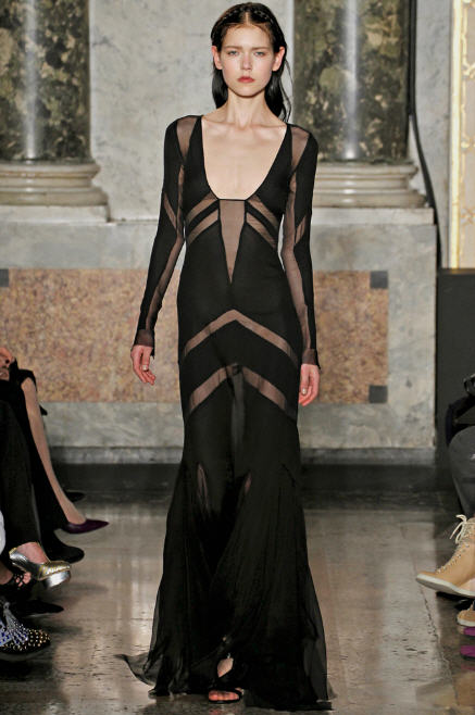 Next up at the 2012 amfAR Cinema Against AIDS Gala is Kylie Minogue who wore a sexy red silk organza long-sleeved gown with geometric sheer inserts from Emilio Pucci’s Fall 2012 collection. How hot is this look?