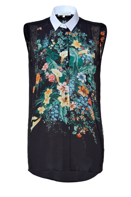 Sandro’s Black Printed Silk Top retails for $235. Visit www.stylebop.com to purchase and www.sandro-paris.com for more information.