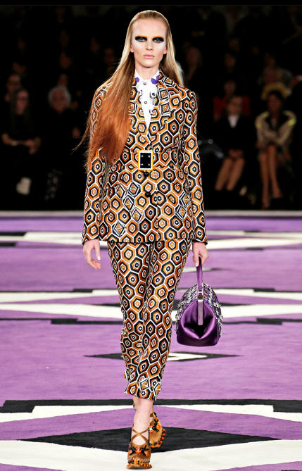 We all know that Anna Dello Russo lives to take style risks and she went bold at the Moncler Gamme Bleu Fashion Show at Spring 2013 Milan Menswear Fashion Week. She wore an Alan Journo fascinator with a printed sleeveless belted jacket and matching pants from Prada’s Fall 2012 collection. She also carried a Prada tote from the same collection.