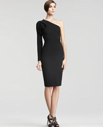 Her dress is crafted from stretch crepe and features a one-shoulder form-fitting silhouette, asymmetric neckline, a right long sleeve with button cuffs and a draped detail which falls from the shoulder.