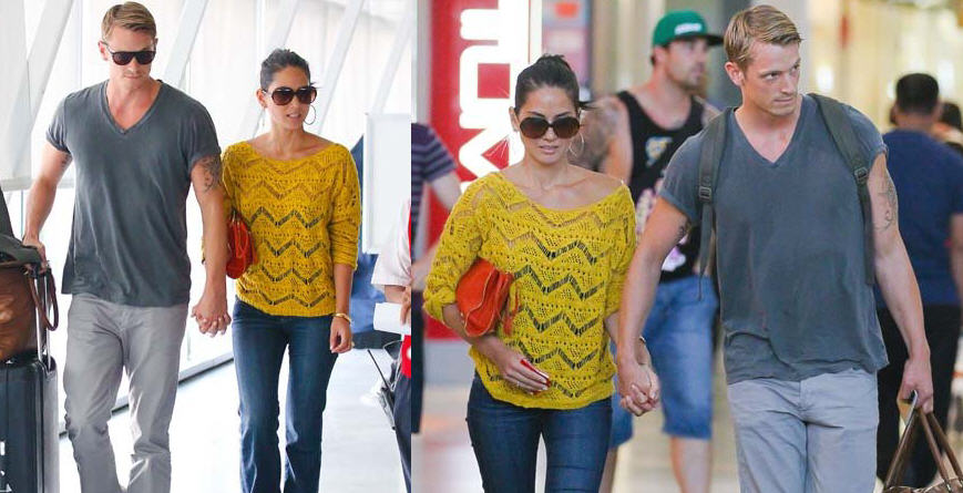She was spotted in the airport with her yummy boyfriend Joel Kinnaman and she kept it casual in oversize sunnies, flare jeans, an orange clutch and Ella Moss’s Kasia Knit Pullover Sweater. A stylish, but relaxed look for travel.