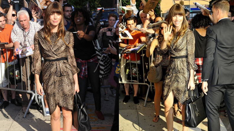 Another winning look from Jessica Biel…she was spotted making an appearance on The Daily Show with Jon Stewart in NYC in an Animal Print Silk Charmeuse Dress from Giambattista Valli. Stunning!