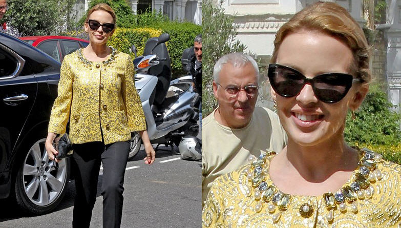 Kylie Minogue wore a charming piece while out and about in London: Dolce & Gabbana’s Embellished Jacket. Yes, it is a little “lady who lunches”, but you can definitely toughen it up with spikes and destructed denim.