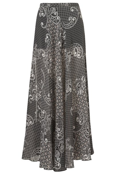 Her black and white paisley printed maxi skirt features thigh-high side slits. Her vachetta leather sandals boast interesting thong wrap detailing for a stylish, yet functional style.