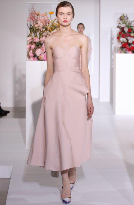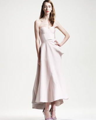 Her gown comes from the Fall 2012 collection and is crafted from colorblock techno stretch satin. It features a strapless sweetheart neckline and an asymmetric bustle back.