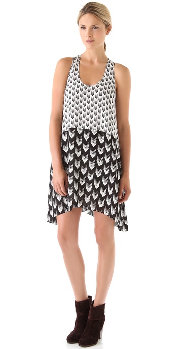 Rachel’s dress is exclusive to Shopbop and is crafted from silk chiffon and lined with jersey. It features two-tone mixed arrow prints, a curved hem, pockets and an easy trapeze racerback silhouette. Her coral bag is slowly becoming an “It” bag in the industry and boasts rope chain shoulder straps and a front flap fastened by a tinker-style turn-lock.