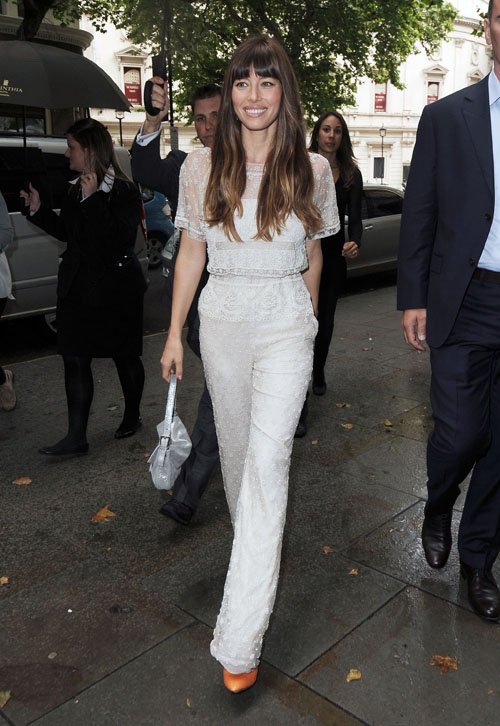 Jessica Biel just keeps wearing hot looks! She was spotted in London in an ethereal beaded jumpsuit from Valentino’s Resort 2013 collection. She gave her look a pop of color with orange point toe pumps.