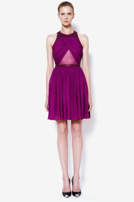 While on The Tonight Show with Jay Leno, she wore a magenta sleeveless dress with a criss-cross bodice, mesh and leather panel and pleated skirt from the brand’s Resort 2013 collection with Casadei Pumps. Cute!