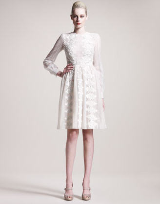 The dress is straight off of the brand’s Fall 2012 runway and features mixed embroidery with two rose panels down the front, pleated shoulders, long sleeves with barrel cuffs, a seamed waist, and a pleated A-line skirt. It is so romantic and elegant.
