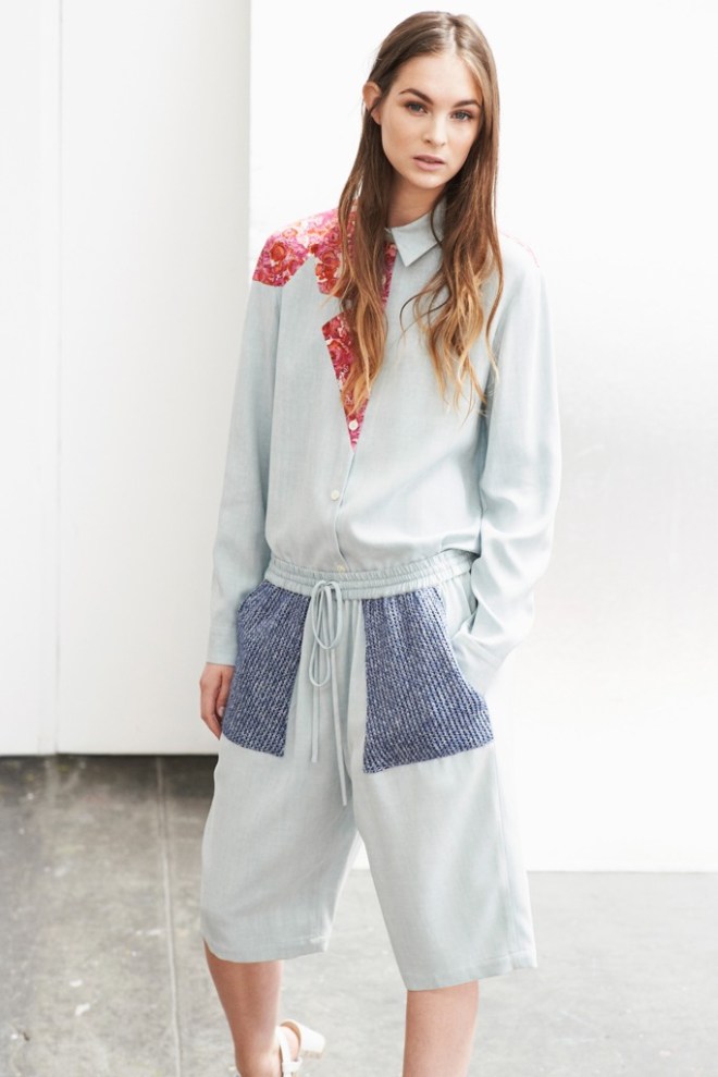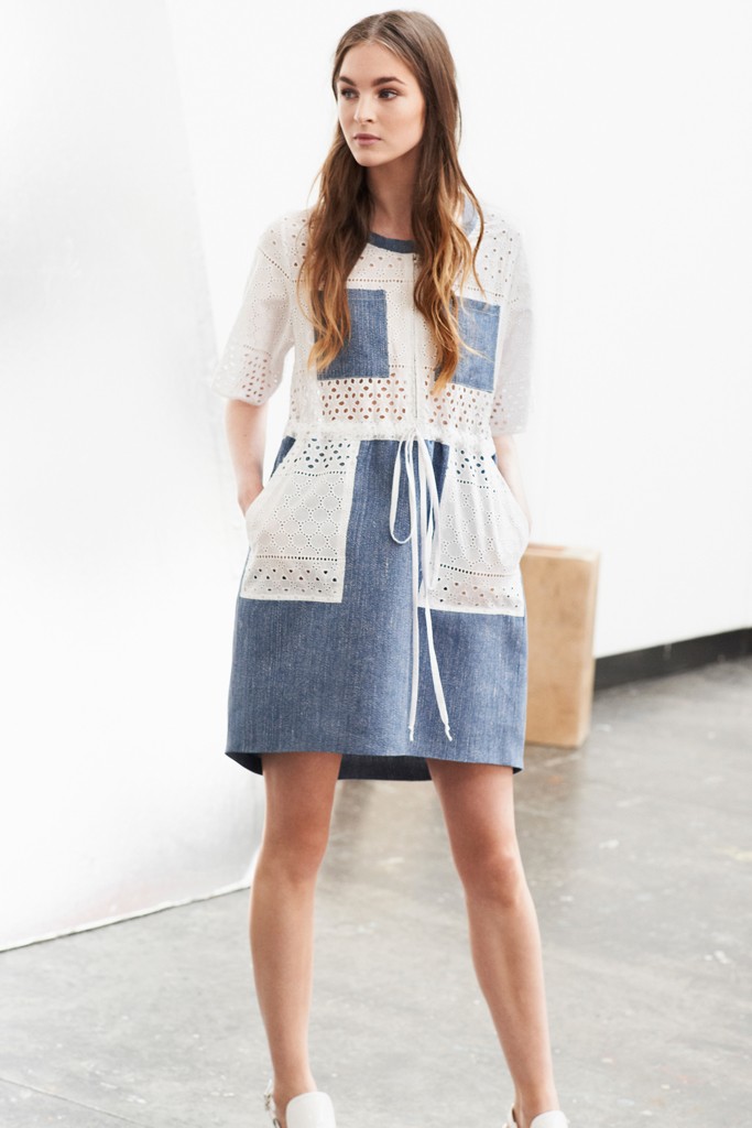 Chambray has become one of my favorite fabrics and it is shown in interesting ways including mixed with eyelet-detailed cotton on a feminine dress with cargo pockets and a strong-shoulder military inspired jacket, as well as a zip-front hoodie that will work perfectly for transitional days.