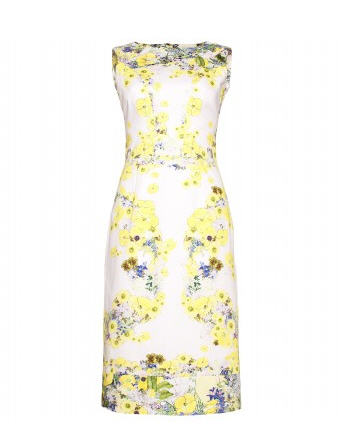 Her silk dress features a tonal lemon and lapis blue multi floral print and a feminine silhouette.