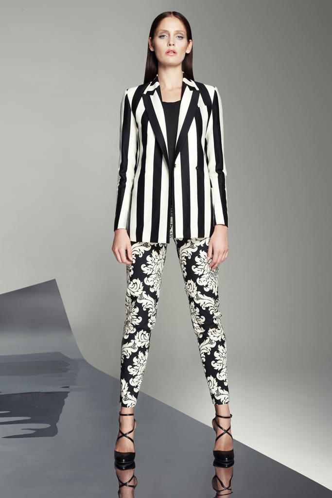 Prints vary between black and white stripes and a wallpaper-inspired baroque pattern in the same shade on blazers, ankle-length skinnies, mini skirts, and red carpet-ready dresses.