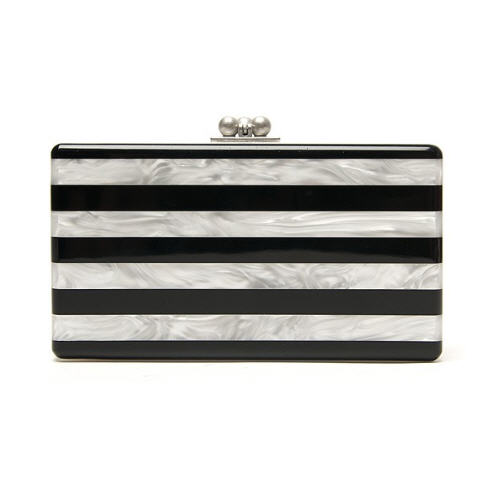 Her silk georgette mini dress features a body conscious silhouette and a a plunging v-shaped open back. Her clutch features black and white stripes for a classic style to add into your wardrobe.