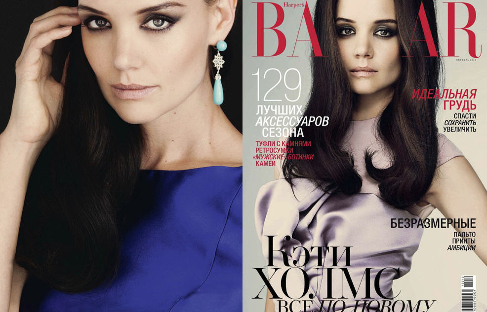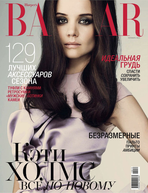 Katie Holmes is the cover girl for Harper’s Bazaar Russia’s October 2012 issue. She looks amazing in looks from Michael Kors, Moschino and more.