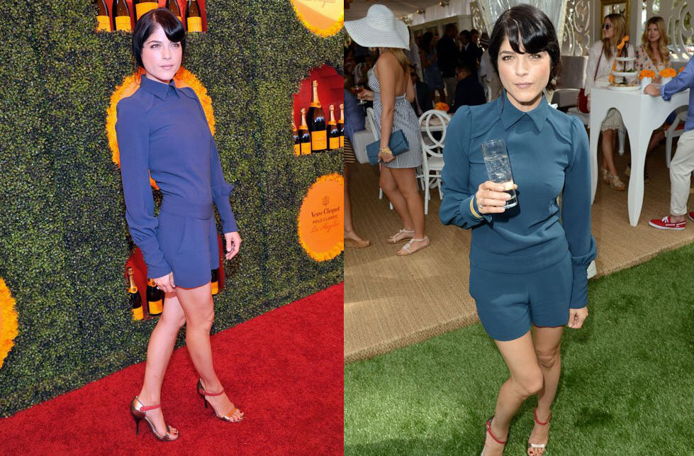 I love Selma Blair! The brunette beauty was spotted at the Third Annual Veuve Clicquot Polo Classic in Los Angeles in a blue wool crepe jumper from Skaist Taylor’s Resort 2013 collection. Cute no?