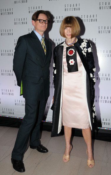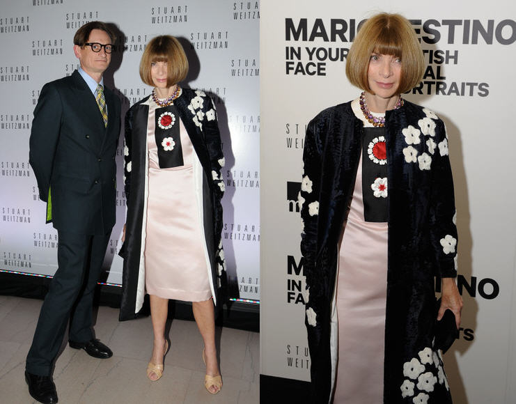 Vogue EIC Anna Wintour wore a black crushed velvet coat with daisy appliqué and a pink satin dress with a floral-embellished panel from Prada’s Spring 2013 collection at the Mario Testino Exhibit Preview at the Museum of Fine Arts in Boston. I am in love with her coat! The color of the dress is a bit tricky in my opinion, but Anna knows what works well for her lean figure and style.