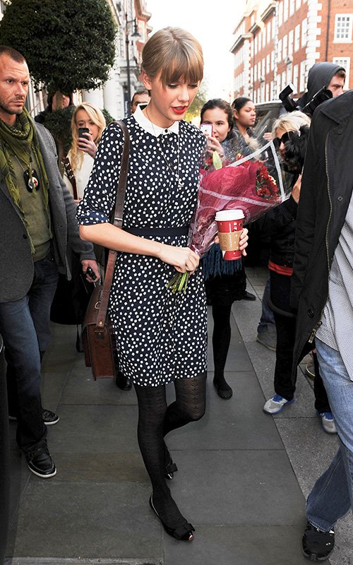 Taylor Swift is taking London by storm and for her latest look, she paired black tights and flats with a NW3 Dice Shirt Dress. Cute!