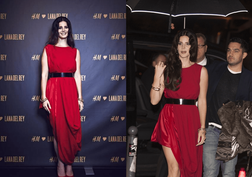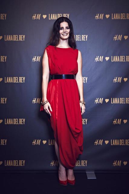 Lana Del Rey wore the collection’s red draped asymmetric dress while doing a private concert for the brand in Berlin. She paired it with a black belt, matching red pumps, and bracelets. Hot!