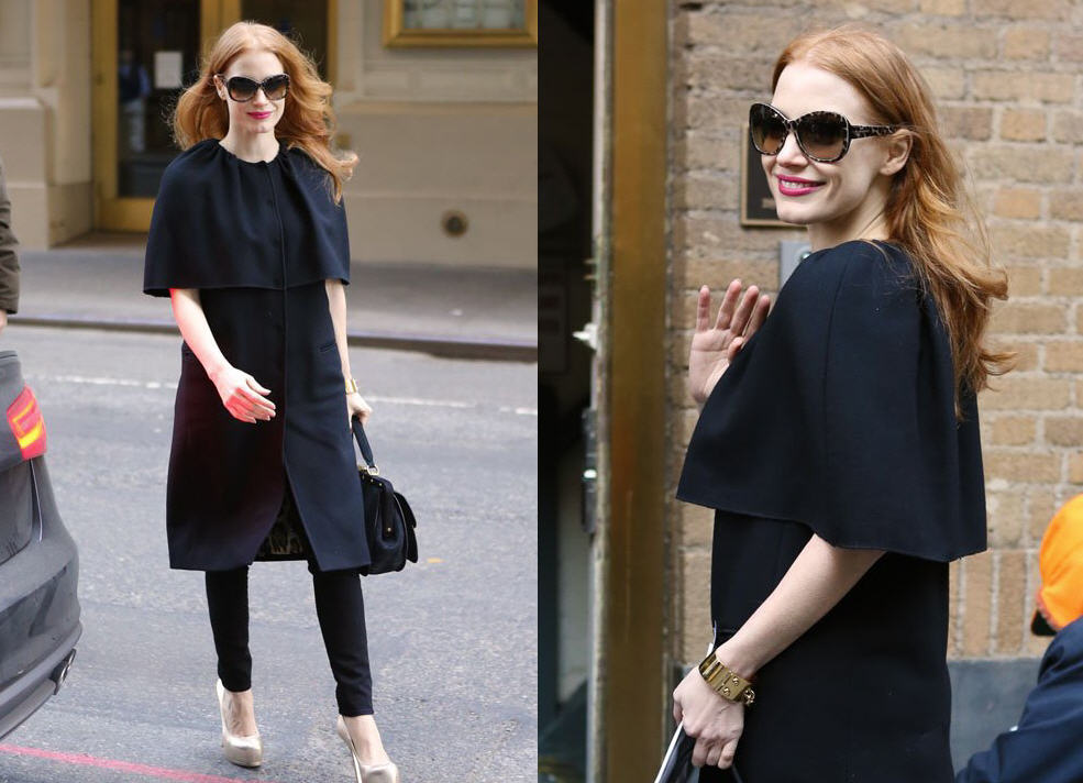 Jessica Chastain was the epitome of elegance while on her way inside the Walter Kerr Theater for her matinee performance of The Heiress. She paired Dolce & Gabbana animal print sunglasses with a Caped Coat from the brand, black skinnies, nude platform pumps and a Gucci Lady Stirrup Top Handle Black Suede Bag.