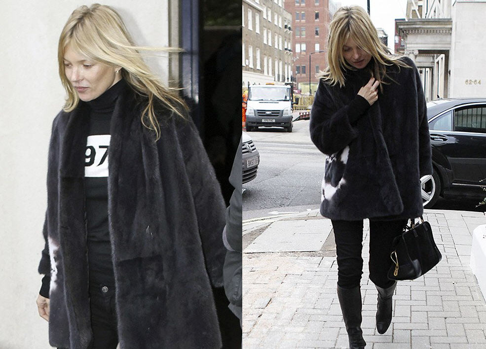 Kate Moss was spotted the day after her birthday in London in all-black, given a pop with a Bella Freud 1970’s Jumper.