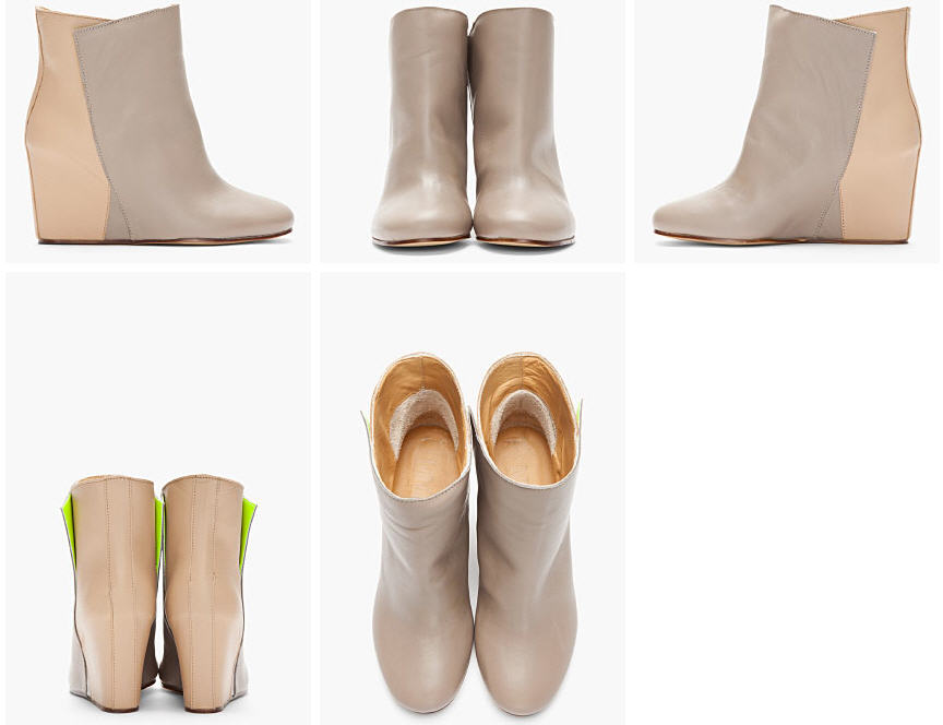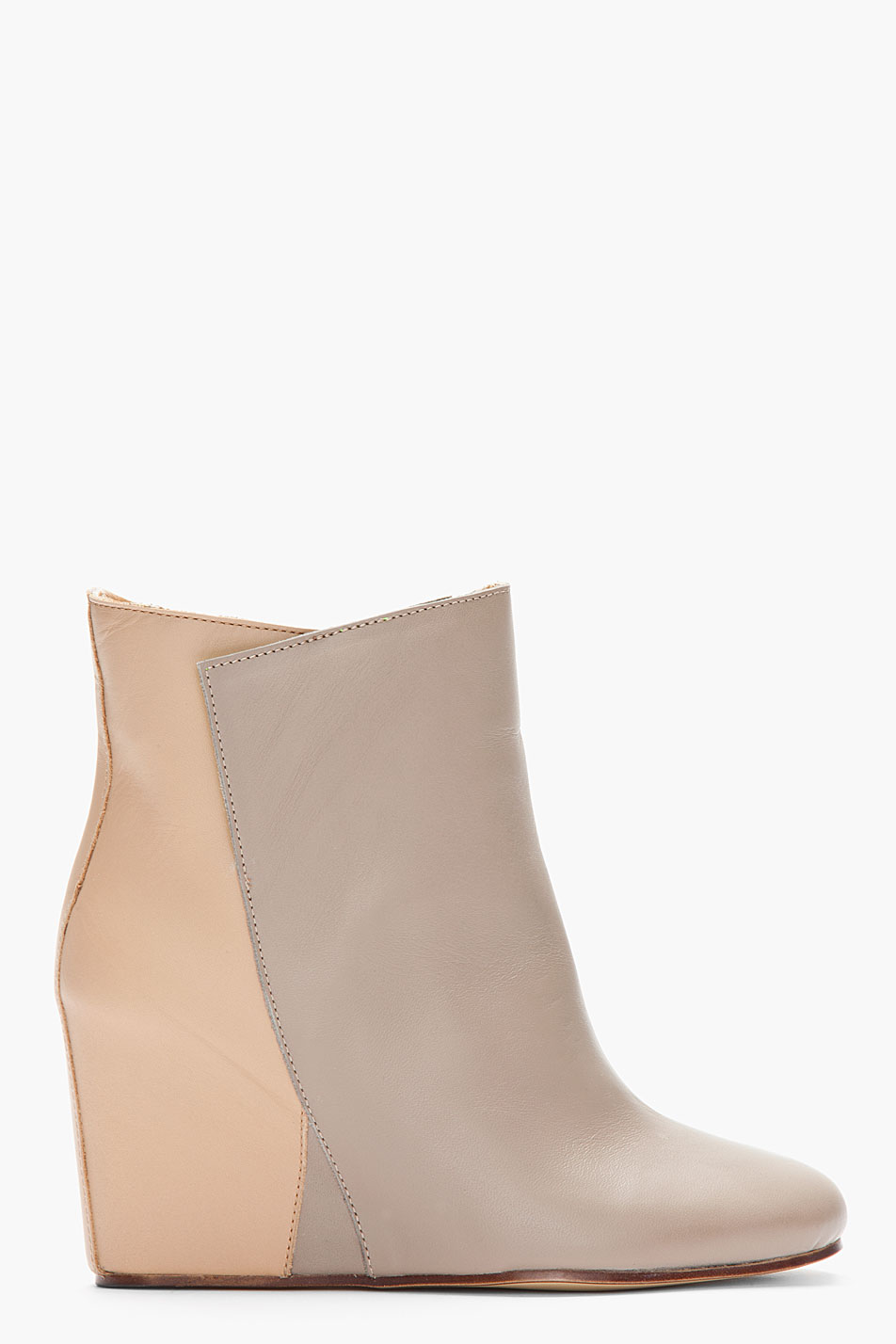 MM6 Maison Martin Margiela’s Taupe Two Tone Leather Wedge Ankle Boots retail for $595. Visit www.ssense.com to purchase and www.maisonmartinmargiela.com for more information.