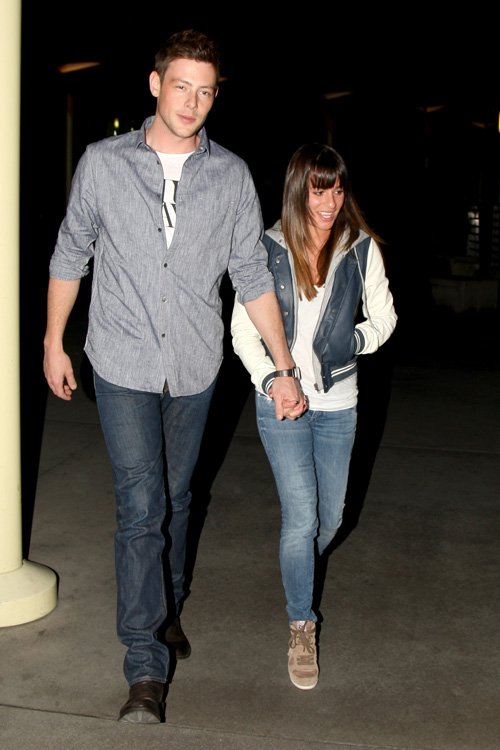 Lea Michele was spotted hand in hand with her boyfriend Cory Monteith at the ArcLight Cinemas in Hollywood. She kept it cute and casual in denim, Obey’s Varsity Lover Jacket and ASH Suede Bowie Wedge Sneakers.