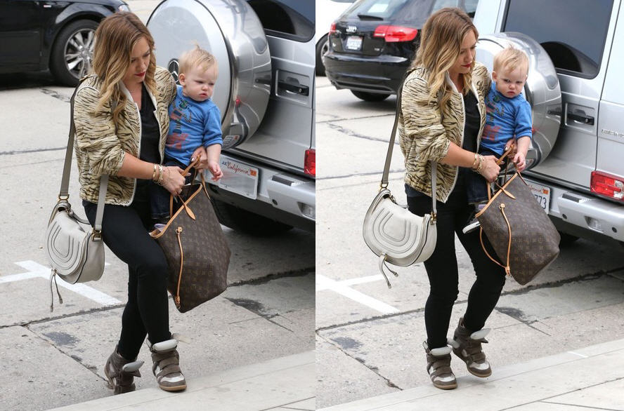Hilary Duff paired an Iro Jeffry Bomber Jacket with black skinnies, a Louis Vuitton tote, Isabel Marant sneakers and a Chloé Marcie Satchel Bag while heading to Restoration Hardware in West Hollywood with her son in tow. Cute look!