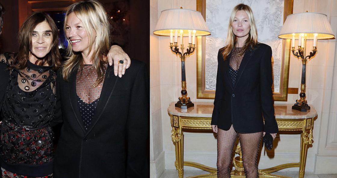 Kate Moss took to the CR Fashion Book Issue 2 Party in Paris in a black blazer from Saint Laurent’s Fall 2013 Menswear Collection over a diamante bodysuit from the fashion house’s Women’s collection of the same season. Hot!