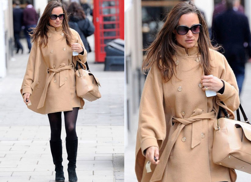 Pippa Middleton looked simple and chic while out and about in London in a nude patent bag, black tights and boots and a Somerset by Alice Temperley for John Lewis Camel Cape Coat.