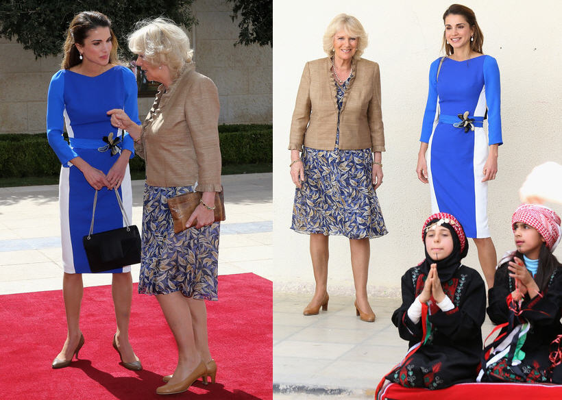 Queen Rania of Jordan paid a visit to Mahis School in Amman, Jordan with Camilla, Duchess of Cornwall in a custom-made Antonio Berardi Colorblock Crepe Dress and a Saint Laurent Betty Mini Chain Suede Shoulder Bag. So chic!