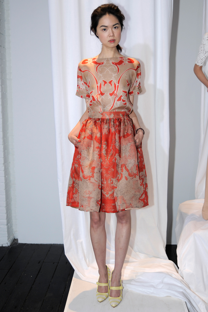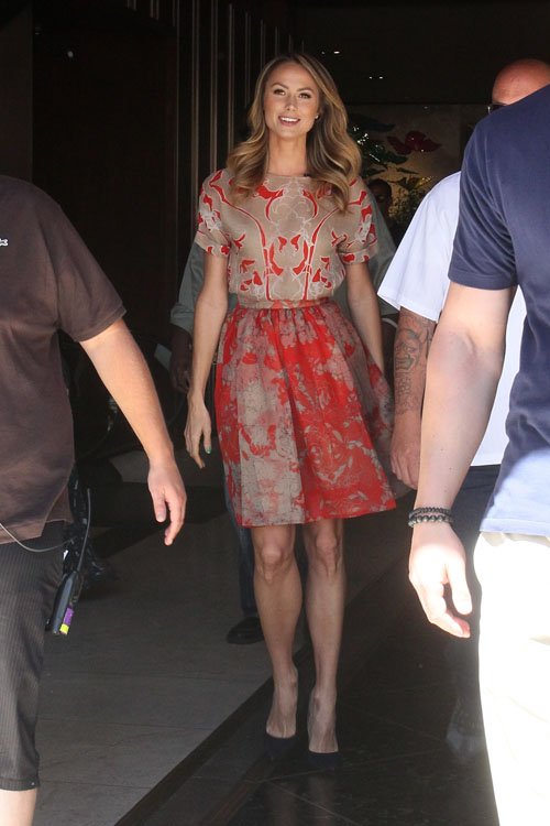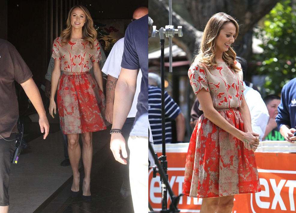 Stacy Keibler was spotted on the set of Extra at The Grove in LA in a printed blouse and skirt from Wes Gordon’s Spring 2012 collection. Pretty!