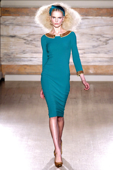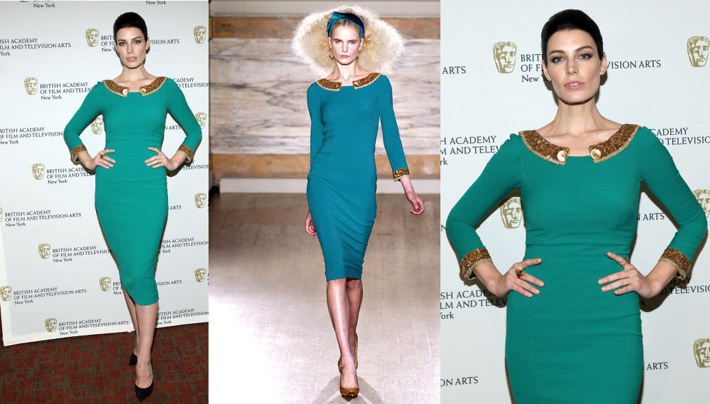 Mad Men actress Jessica Pare took to the show’s BAFTA Panel in the Big Apple in an emerald green dress with a gold collar and cuffs from L’Wren Scott’s Fall 2013 collection. Gorgeous no?