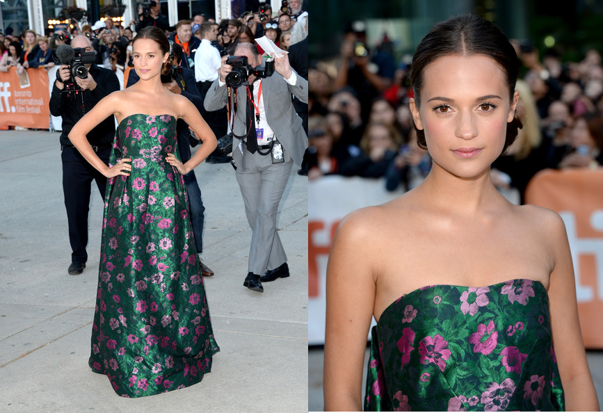 Alicia Vikander is effortlessly beautiful and she looked that and more at The Fifth Estate Premiere during the 2013 Toronto Film Festival. The Swedish actress slipped on a strapless floral jacquard gown from Erdem’s Pre-Fall 2013 collection.
