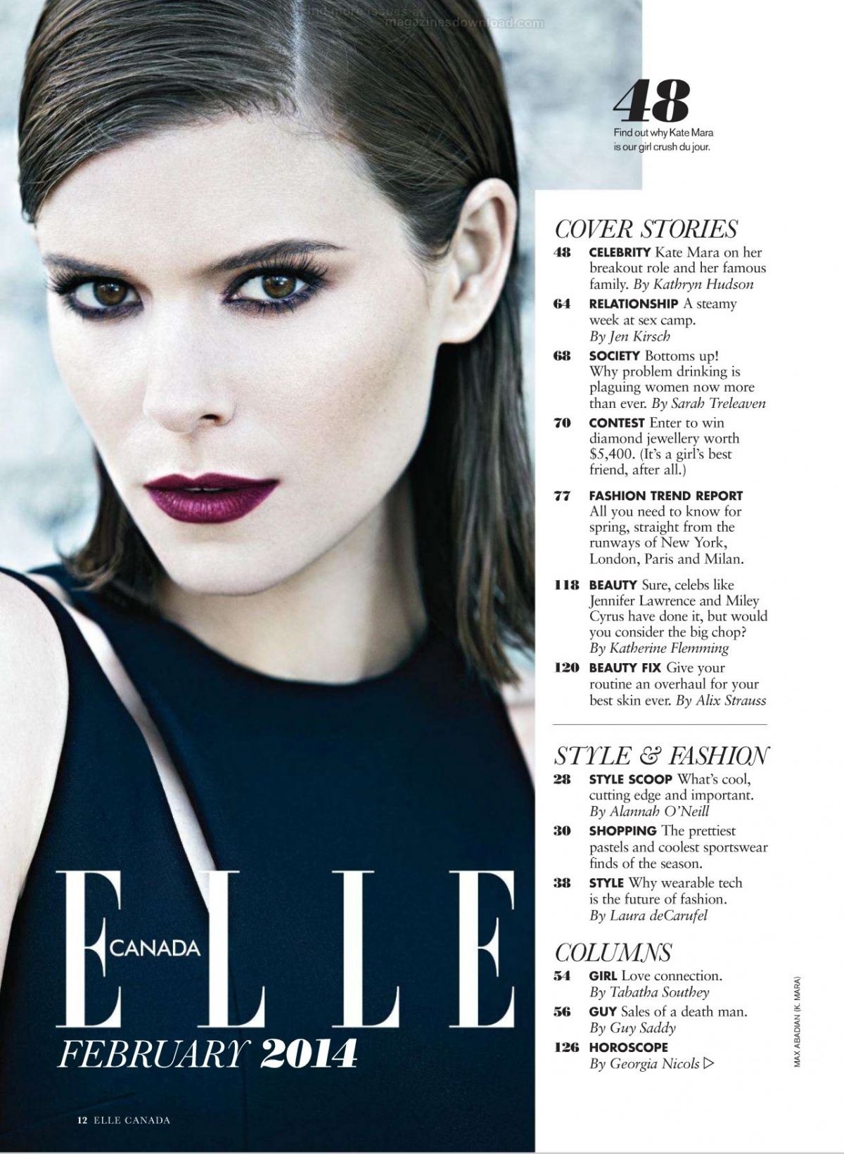 House of Cards actress Kate Mara is the cover girl for ELLE Canada’s February 2014 issue posing in pieces from T Alexander Wang, Barbara Bui, Mary Katrantzou, and more.