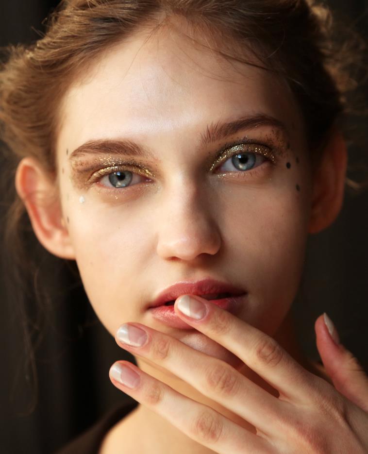 A luminous and celestial face, using glitter of different sizes and textures to demonstrate the rich fabrics and craftsmanship of the brand’s Fall 2014 collection. The runway designs were inspired by culinary artist Ferran Adria.