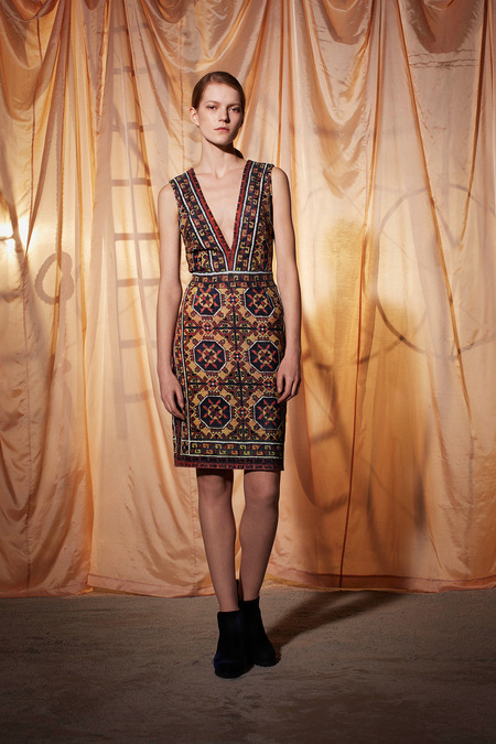 I thoroughly expect the brand’s fans including Nicole Scherzinger, Beyoncé Knowles, Hilary Duff, and Katy Perry to gravitate toward a number of Fall designs. A scarab print mini dress was actually the exact opposite of creepy crawly, while a frock of the same length covered in a pattern that one might find in a souk in Marrakech would look killer on the red carpet with a sleek chignon and red lips.