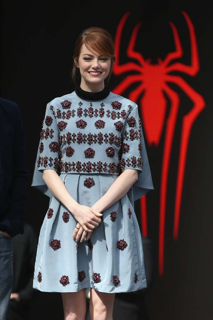 In her latest The Amazing Spider-Man 2: Rise Of Electro promotional look, Emma Stone sported a beaded cape dress from Erdem’s Fall 2014 collection. This was fun no?