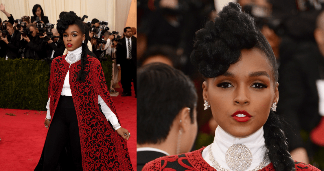 Janelle Monae added a splash of red to her signature black and white look, slipping on an embroidered cape in the fiery hue from Tadashi Shoji’s Fall 2014 collection at the 2014 Met Gala. She anchored her look with Jimmy Choo Damek Sandals. I loved the drama of this ensemble!