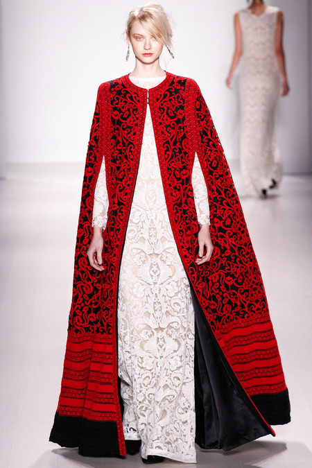 Visit www.tadashishoji.com and www.jimmychoo.com for more information and see Janelle’s cape on the runway below, worn by Nastya Kusakina.