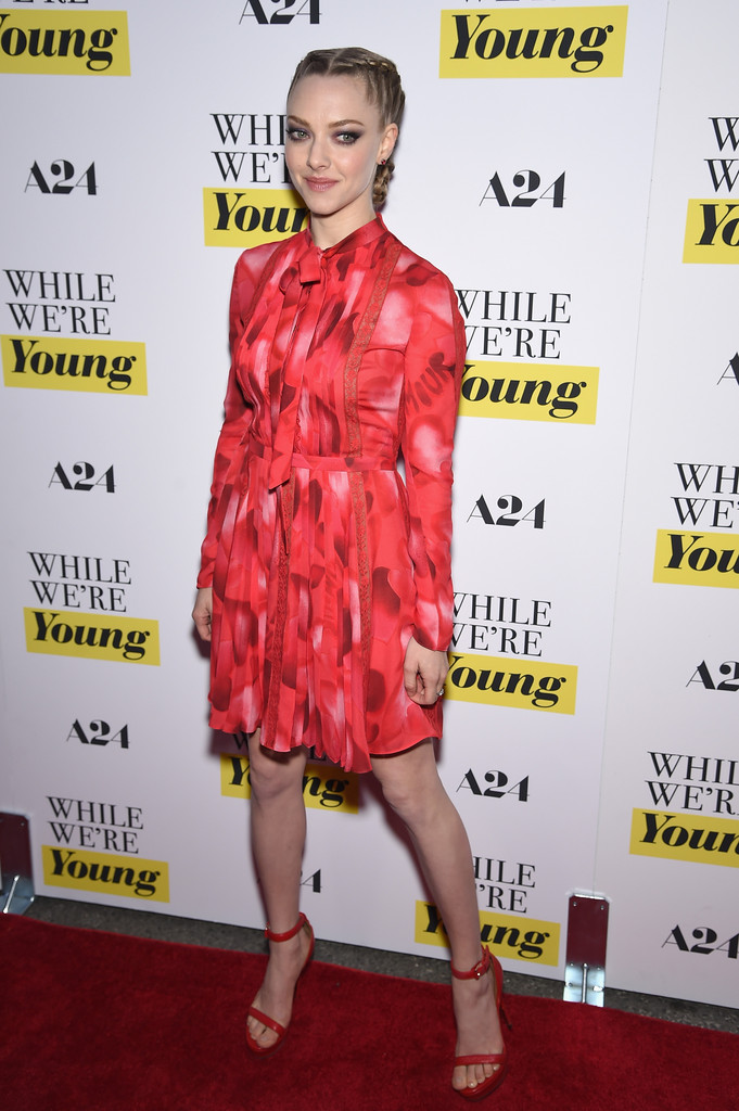 Amanda Seyfried was a breath of fresh Spring air at the While We’re Young New York Premiere, choosing a red and white printed tie-neck dress from Valentino’s Pre-Fall 2015 collection. Her braided hairstyle only added to the look’s elegance.
