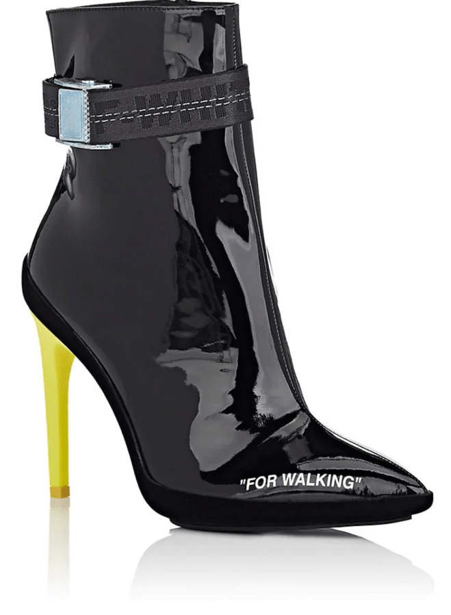 Her vinyl pants feature a front fastening and belt loops. Her patent leather booties boast an ankle-length, pointed-toe silhouette, logo-embroidered nylon straps, contrast 4″ yellow velvet heels, concealed side zip closures, and contrast “For Walking” lettering.