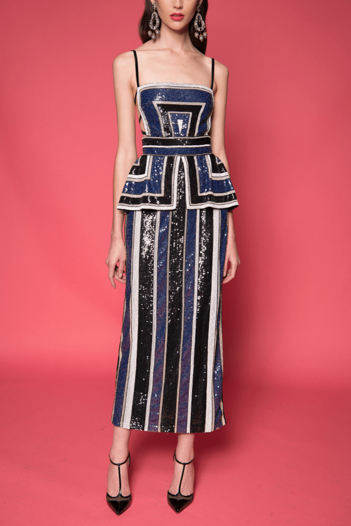 naeem-khan-striped-beaded-peplum-tea-length-dress