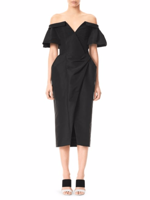 Get Cardi B’s Carolina Herrera Off the Shoulder Cocktail LBD, Worn at the Warner Music Group Pre-Grammy Party in New York City